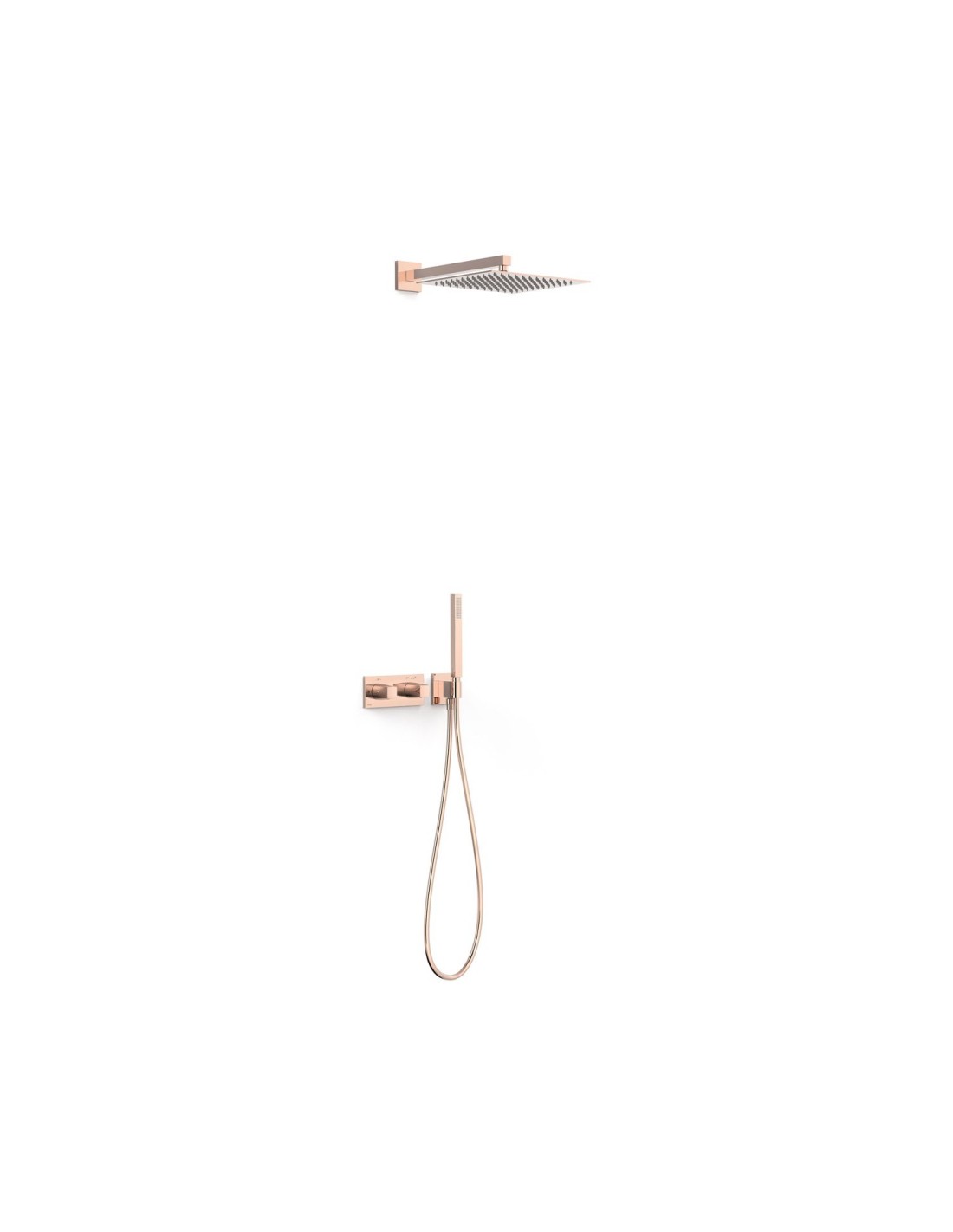 Structure thermostatique encastrée à installation horizontale incluse.· Régulateur de débit et distributeur céramique à 2 voies.· Volant carré-rond.· Bras mural avec pommeau de douche orientable en acier inoxydable : 300 x 300 mm.· Support pour douchette à main avec arrivée d'eau murale.· Douchette à main anticalcaire en laiton.· Flexible satin.