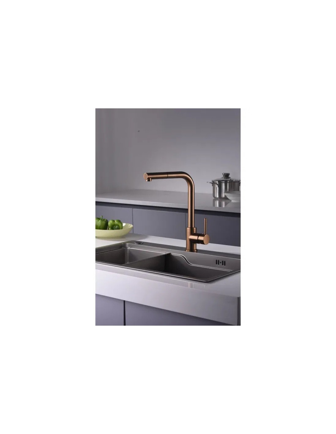 Sanitshop propose Ce produit appartient à la catégorie Robinetterie de cuisine (robinets pour éviers): éco-efficace (avec régulateur de débit, avec arrêt automatique pour économiser l\'eau), avec douchette (avec pommeau de douche), avec bec amovible (extensible, avec flexible), avec bec pivotant, de couleur or rose, de rebord, à bec haut , mitigeur (monobloc), en laiton, de style moderne.