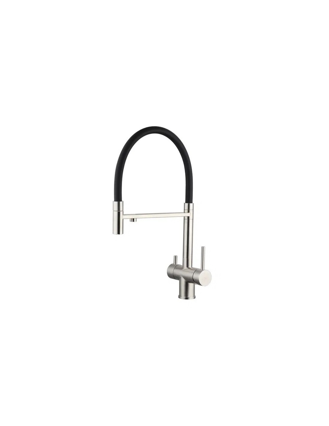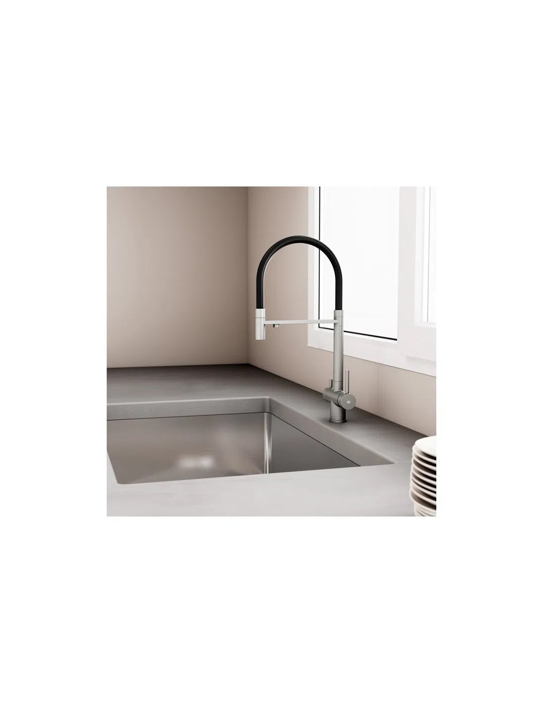 Sanitshop propose Ce produit qui appartient à la catégorie Robinetterie de cuisine (robinets pour éviers): avec osmose (eau filtrée), avec bec amovible (extensible, avec flexible), de couleur noire, de rebord, à bec moyen , mitigeur (monobloc), en acier inoxydable, de style moderne.