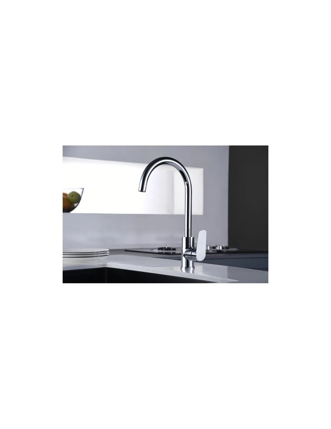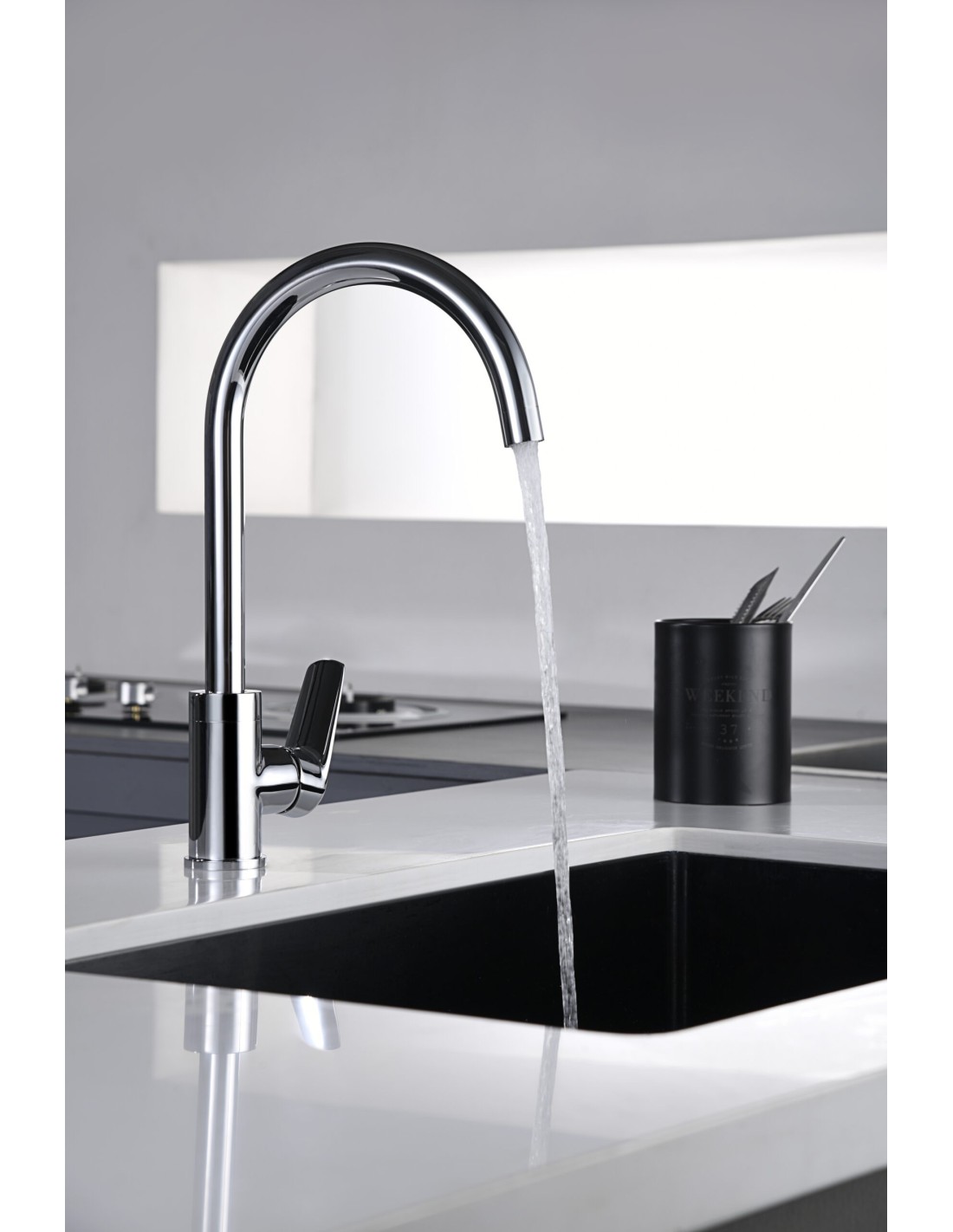 Ce produit appartient à la catégorie Robinetterie de cuisine (robinets pour éviers): de couleur chromée, de rebord, à bec haut , mitigeur (monobloc), en laiton, de style moderne.