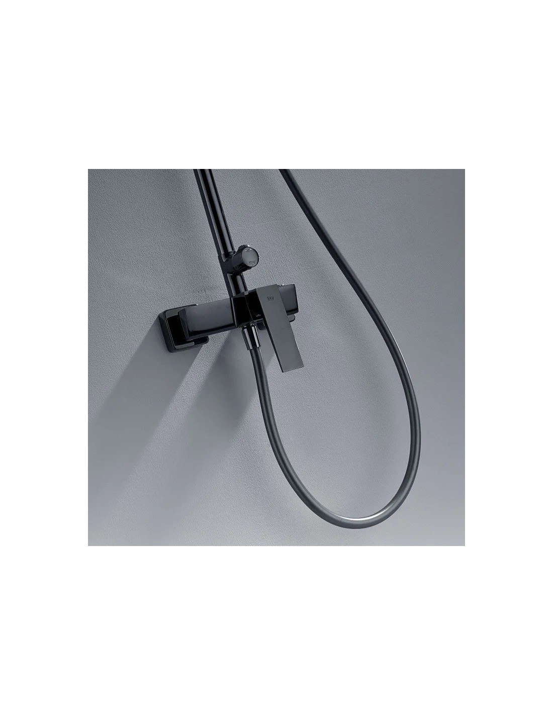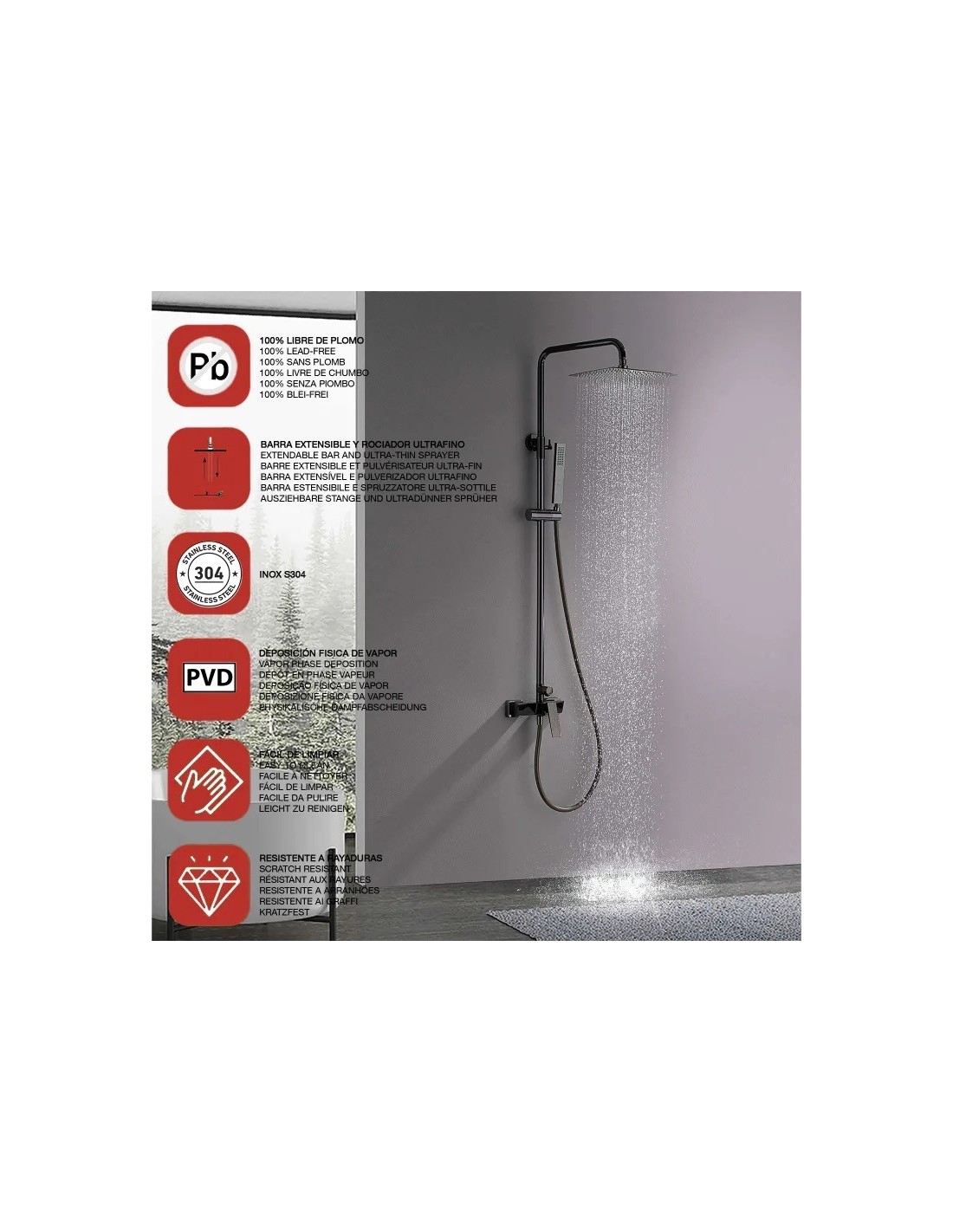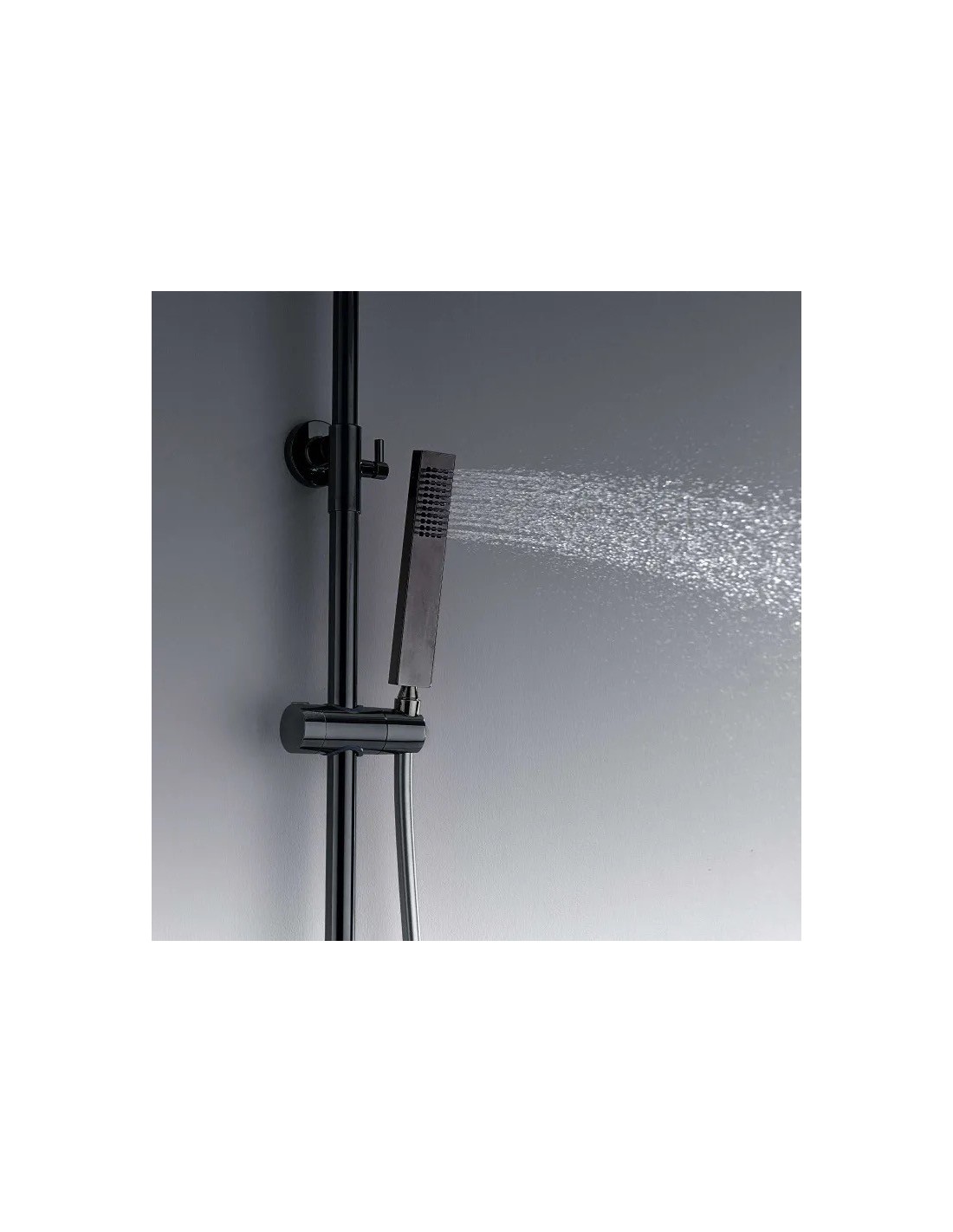 Sanitshop propose ce produit qui  appartient à la catégorie Colonnes de douche (colonnes de douche avec hydromassage): de douche uniquement, de couleur noire, teléscopiques (avec hauteur réglable), en laiton, mitigeurs (une poignée), avec pomme haute supérieure carrée, de style moderne.