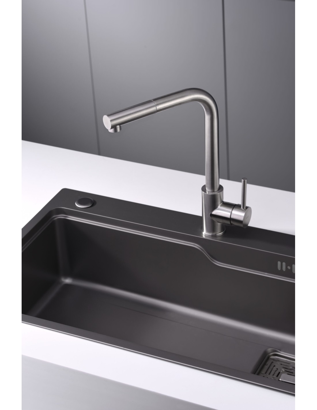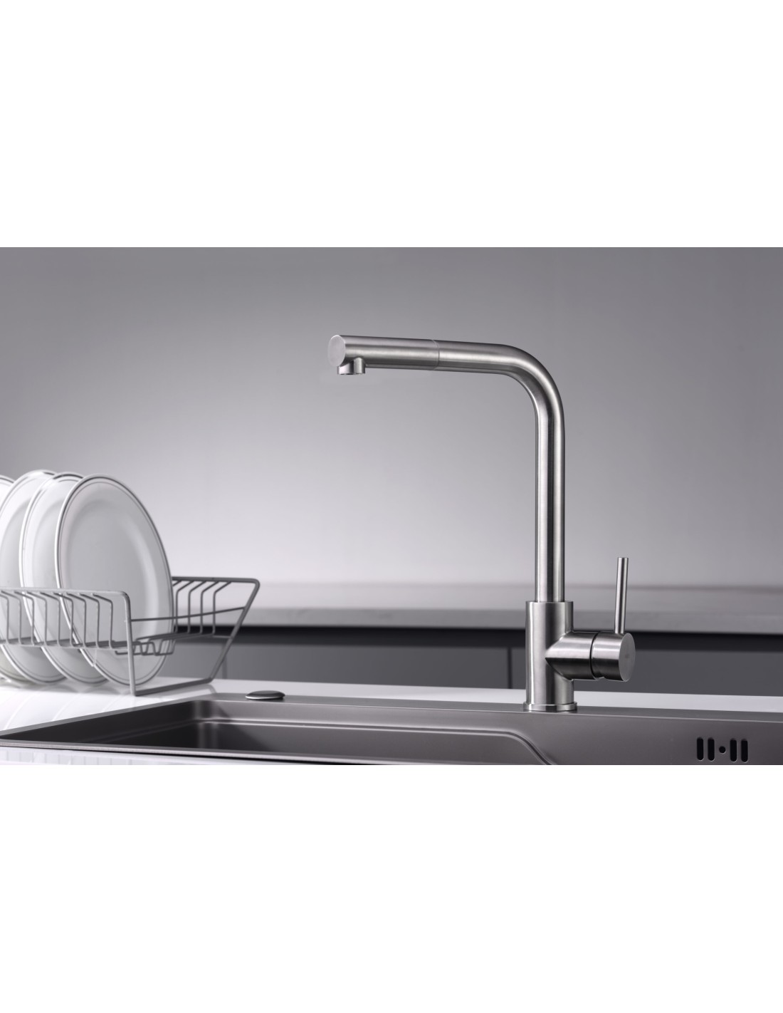 • Possède un ressort résistant avec une grande mobilité. Possibilité d'extraire la partie finale du bec pour utiliser le tuyau avec douchette, qui apportera une liberté pour pouvoir atteindre n'importe quelle partie du bac.