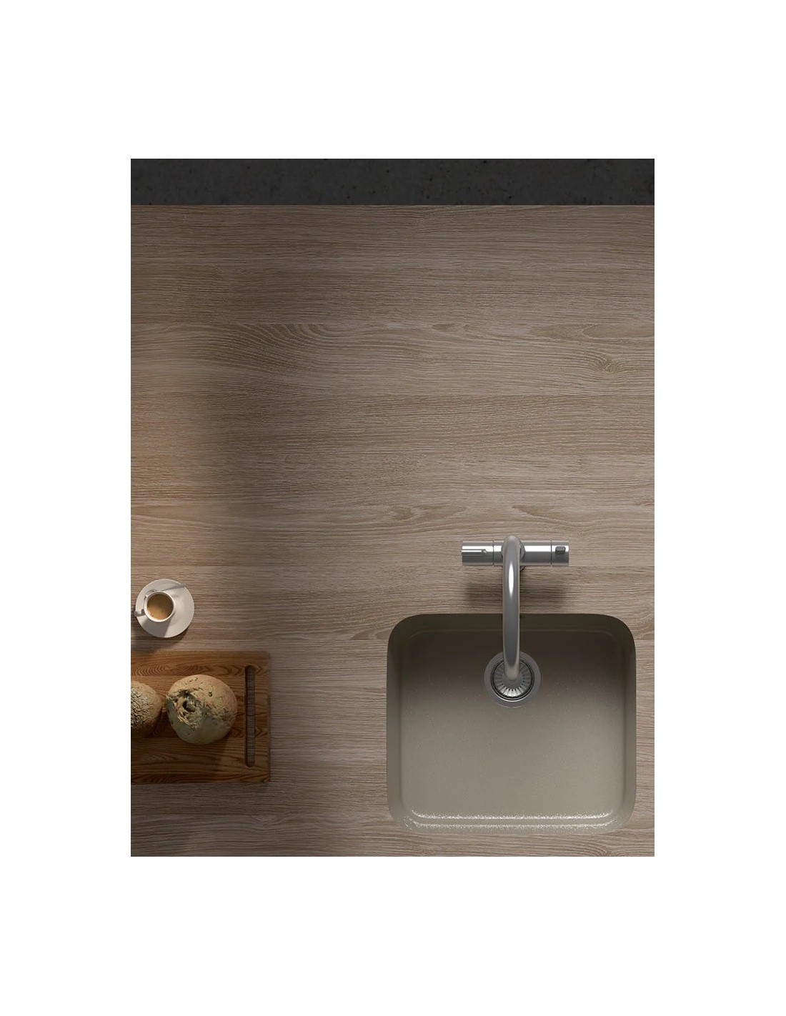 Sanitshop propose ce produit qui  appartient à la catégorie Éviers de cuisine: en résine et charges minérales (synthétiques), sans trou de robinetterie, encastrés sur le plan, encastrés sous le plan, étroits de 50 cm (centimètres) ou moins de long (petits, compacts), en couleurs, à 1 bac (cuve, vasque), de style moderne, de forme carrée.