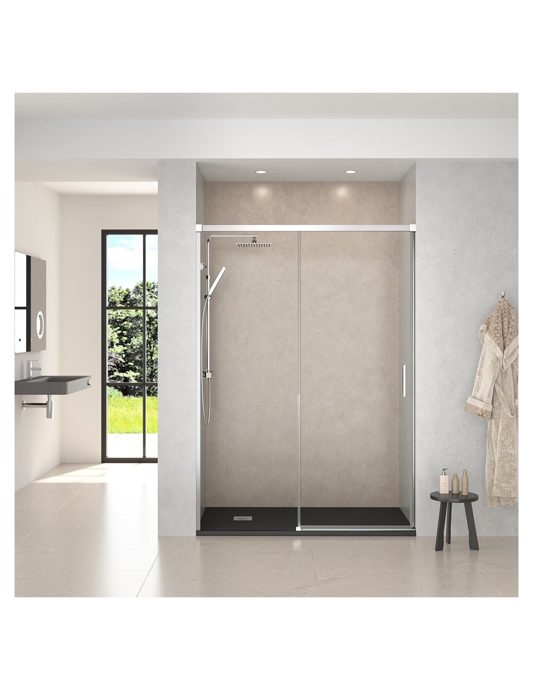 - Système d'ouverture : portes coulissantes via rail supérieur. Système de double poulie silencieuse de 2 roues par porte et 3 pour les parois supérieures ou égales à 140 cm.