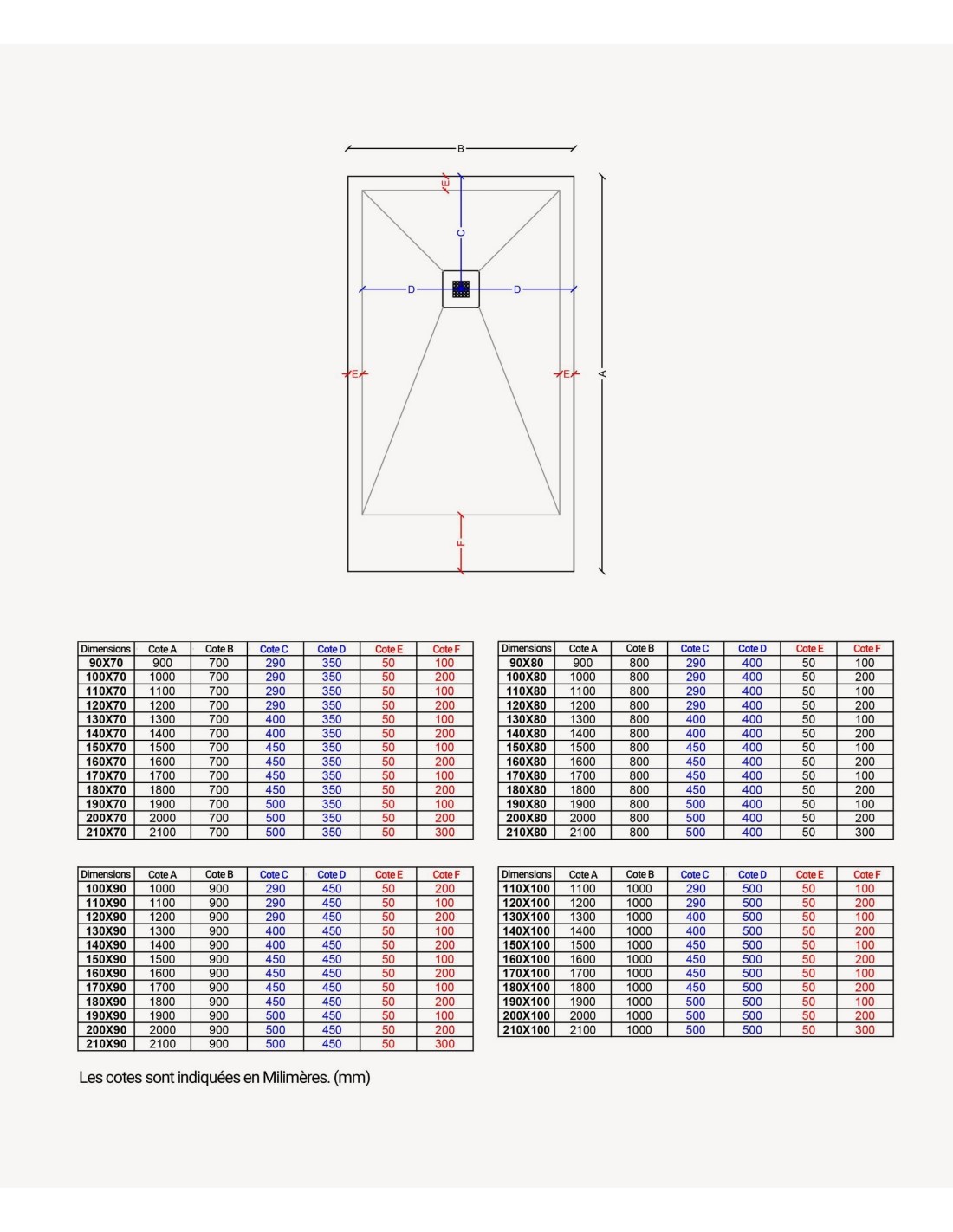 - Les dimensions en stock sont celles qui se terminent par 0. Pour le reste des dimensions, le receveur douche choisi est celui d'une dimension supérieure, il sera ensuite découpé sur mesure en usine. Ce processus augmente le délai de livraison.