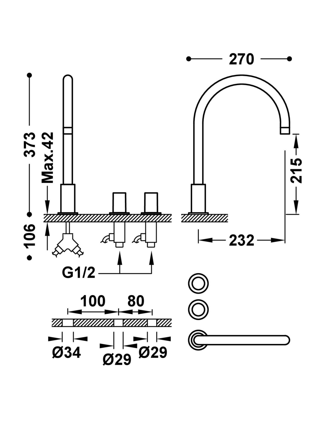 • Installation nécessitant trois orifices, celui pour le bec (de 3,4 cm de diamètre) et les deux autres pour les poignées (de 2,9 cm de diamètre chacun).