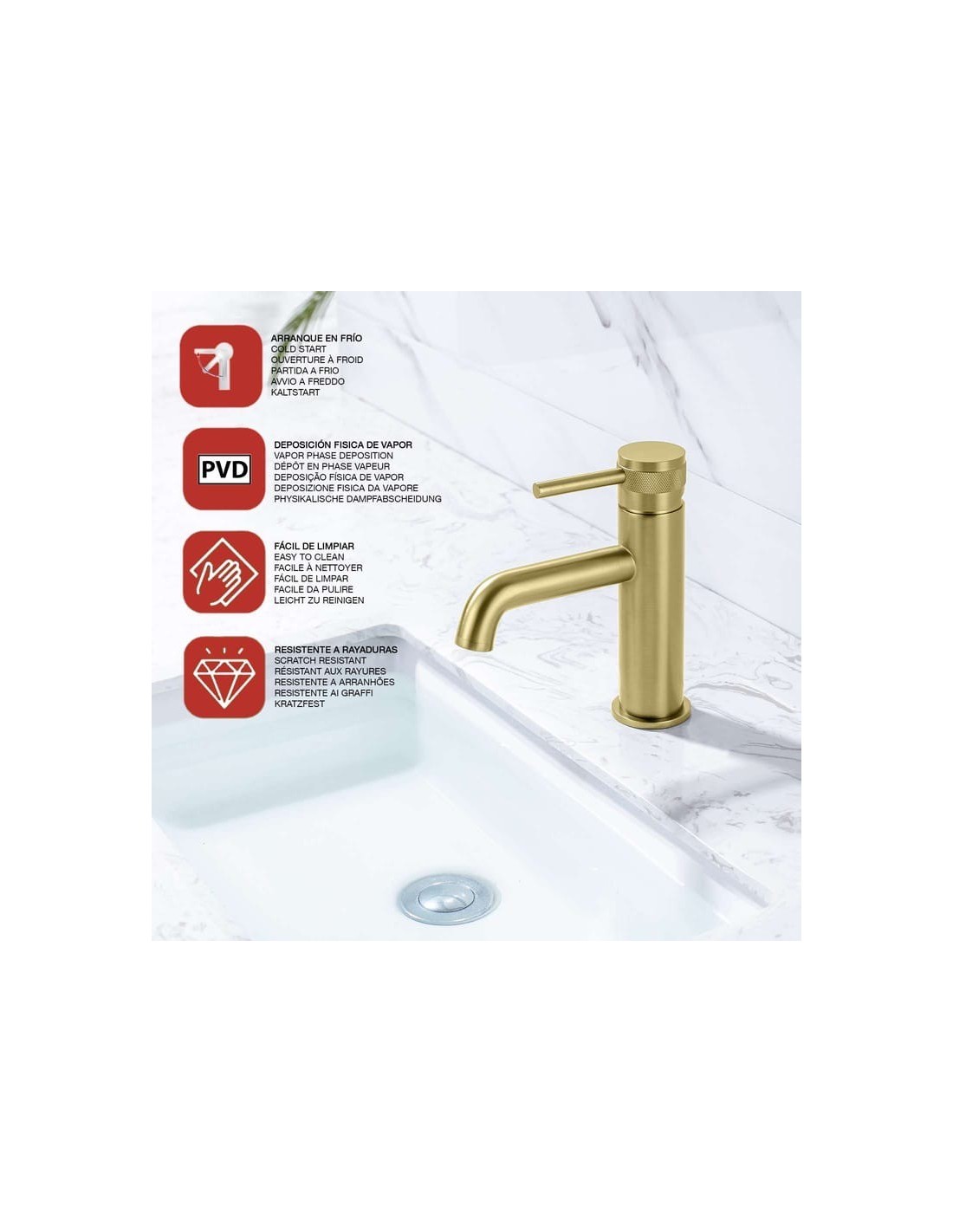 Sanitshop propose ce produit qui se trouve dans la catégorie Robinets de lavabo et vasque (robinetterie pour la salle de bains, robinets pour lave-mains, robinets pour vasque): de rebord, avec bec bas , avec bec court , en laiton, mitigeurs (une poignée), de style moderne, de couleur Oro cepillado pvd , de corps rond.
