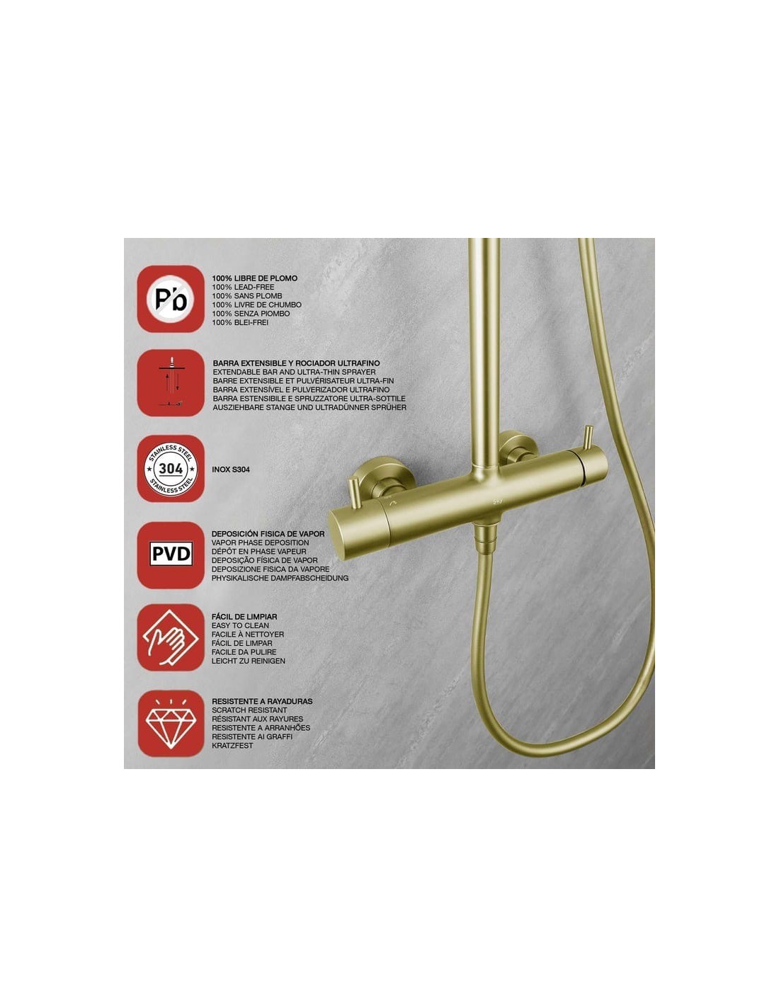 COLONNE DE DOUCHE EXTENSIBLE EN LAITON AVEC CIEL DE PLUIE ET DOUCHETTE A MAIN ORO CEPILLADO PVD "COLLECTION PROMISE SKY BATH"