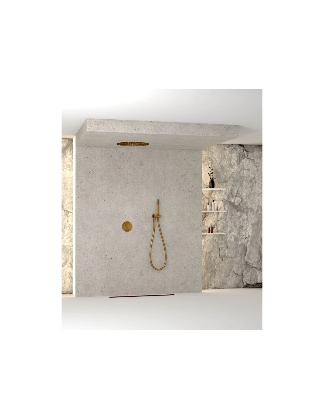 • Ensemble avec robinet mitigeur, pomme haute encastrée au plafond, pommeau de douche, support et flexible.
