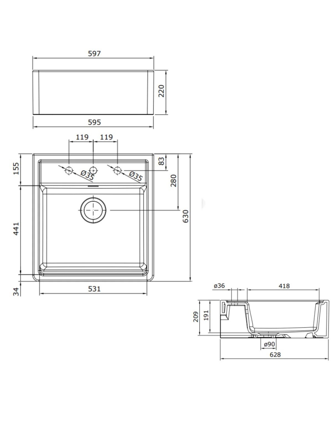 - Évier rectangulaire à un bac, à encastrer sous plan.