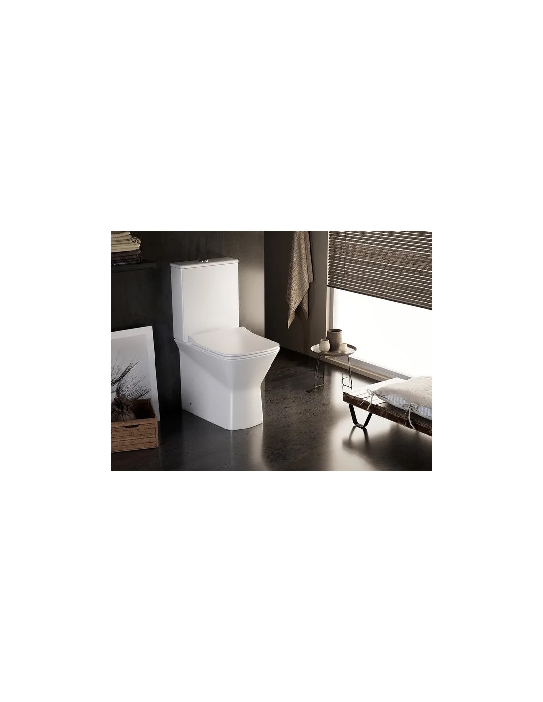 Sanitshop propose ce produit qui appartient à  la catégorie Toilettes (WC, water, cuvettes): à poser (au sol), de sortie verticale (évacuation au sol), de sortie horizontale (évacuation au mur), de sortie double (évacuation au mur ou au sol), avec abattant frein de chute (fermeture en douceur), de réservoir bas (standard), d'alimentation inférieure, de forme carrée, en porcelaine (céramique, faïence), de style moderne, de couleur blanche, compacts (collés au mur), avec technologie rimless (auto-nettoyage).