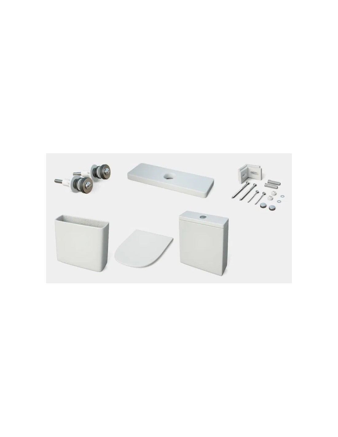 • WC complet avec cuvette à double sortie (au mur ou au sol), réservoir avec alimentation inférieure, abattant et siège.