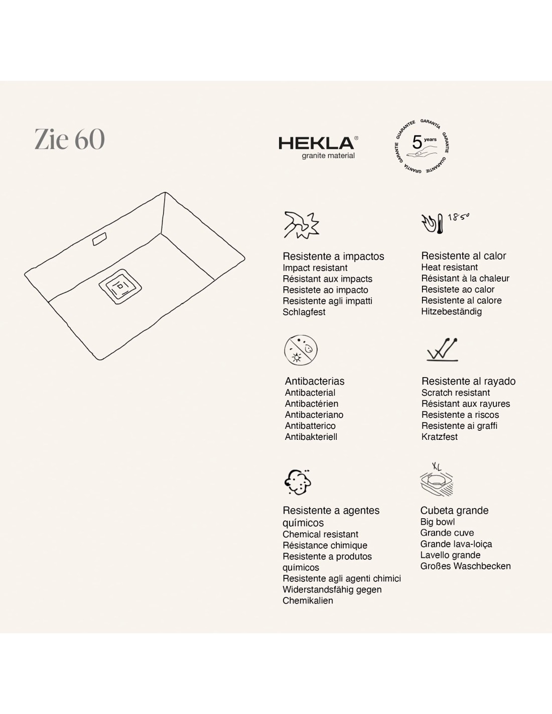 - Fabriqué en Hekla, matériau innovant qui combine 80 % quartz et 20 % de résine, conçu pour être durable et résistant aux rayures et aux impacts.