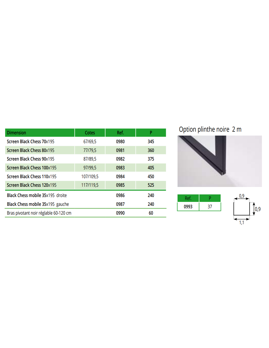 Combinaison pour ce prix : Paroi Screen Black Chess classique (ref 0980) + Bras pivotant noir réglable (ref 0990) + Profil d'union 2 verres fixes (ref 0992)