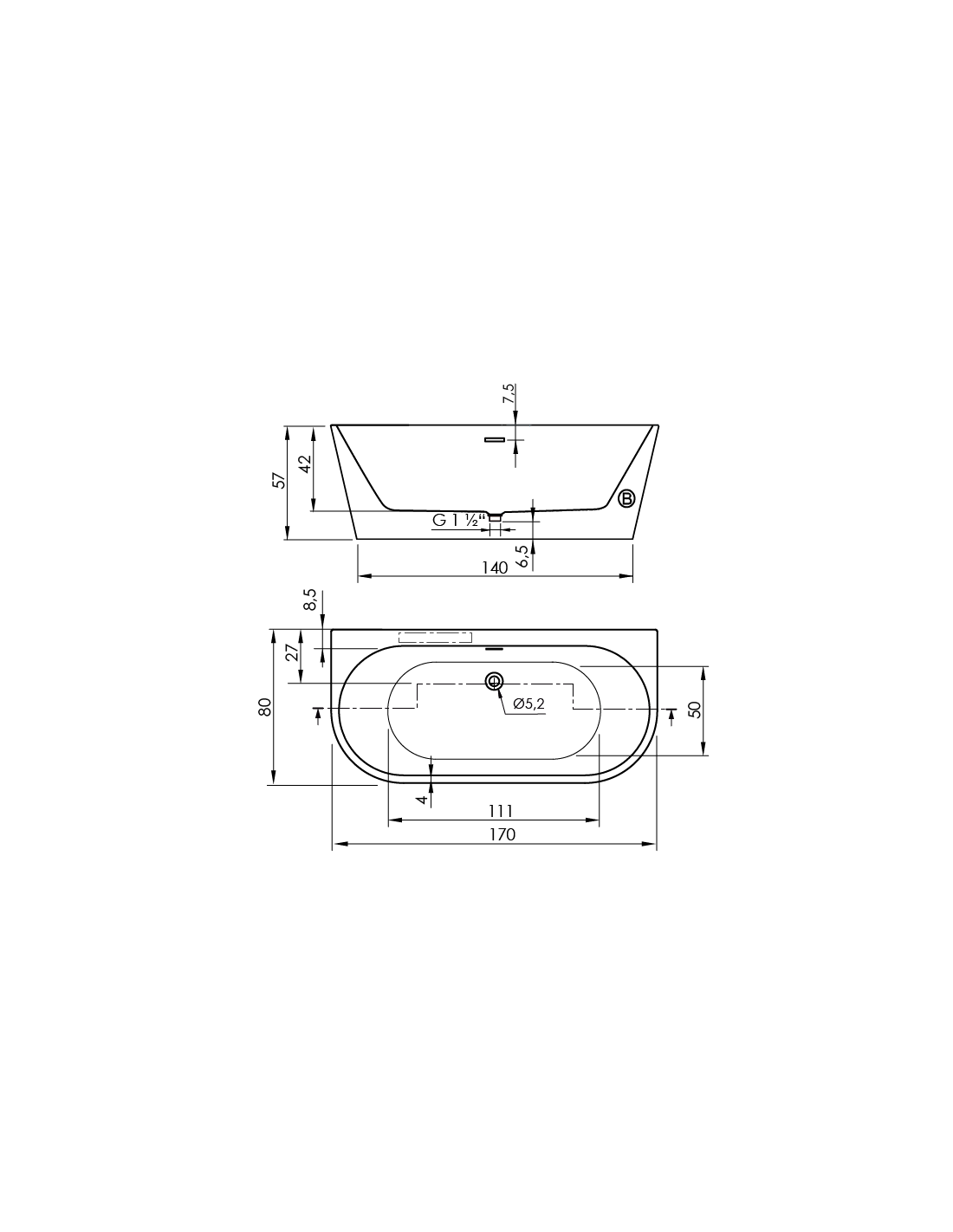Baignoire acrylique murale avec bonde click-clac avec débordement intégré blanc brillant