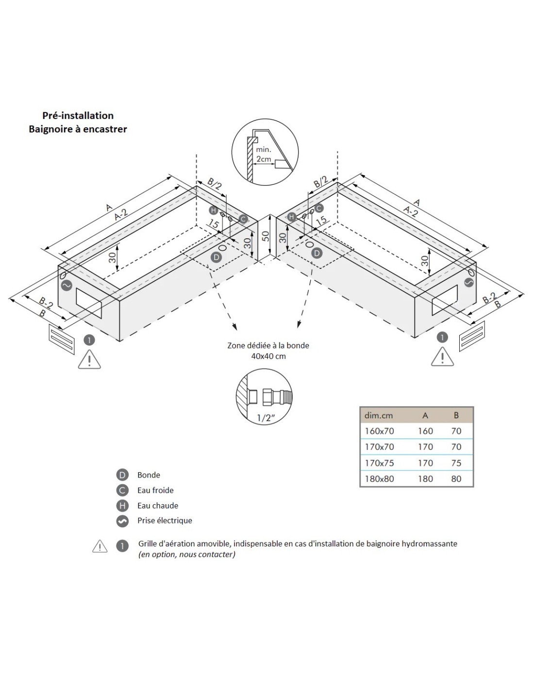 Fabriquée en acrylique de haute qualité, cette baignoire encastrée, fournie avec son tablier, est surélevée pour reposer la tête, garantissant un soutien ergonomique et un confort optimal pendant vos moments de relaxation. Elle est également munie de poignées intégrées, vous permettant de vous relever facilement et en toute sécurité.