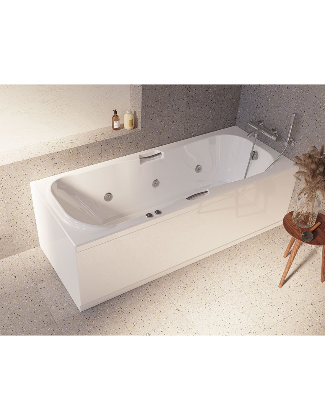 Fabriquée en acrylique de haute qualité, cette baignoire encastrée, fournie avec son tablier, est surélevée pour reposer la tête, garantissant un soutien ergonomique et un confort optimal pendant vos moments de relaxation. Elle est également munie de poignées intégrées, vous permettant de vous relever facilement et en toute sécurité.