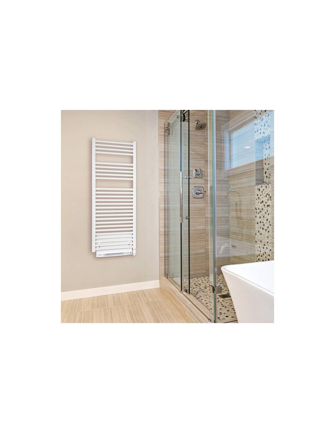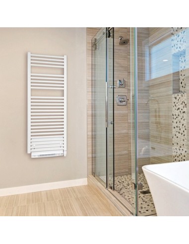 Radiateur sèche-serviettes électrique design pour installation verticale en acier époxy blanc RAL9016 + thermostat électronique avec système de soufflerie intégré.