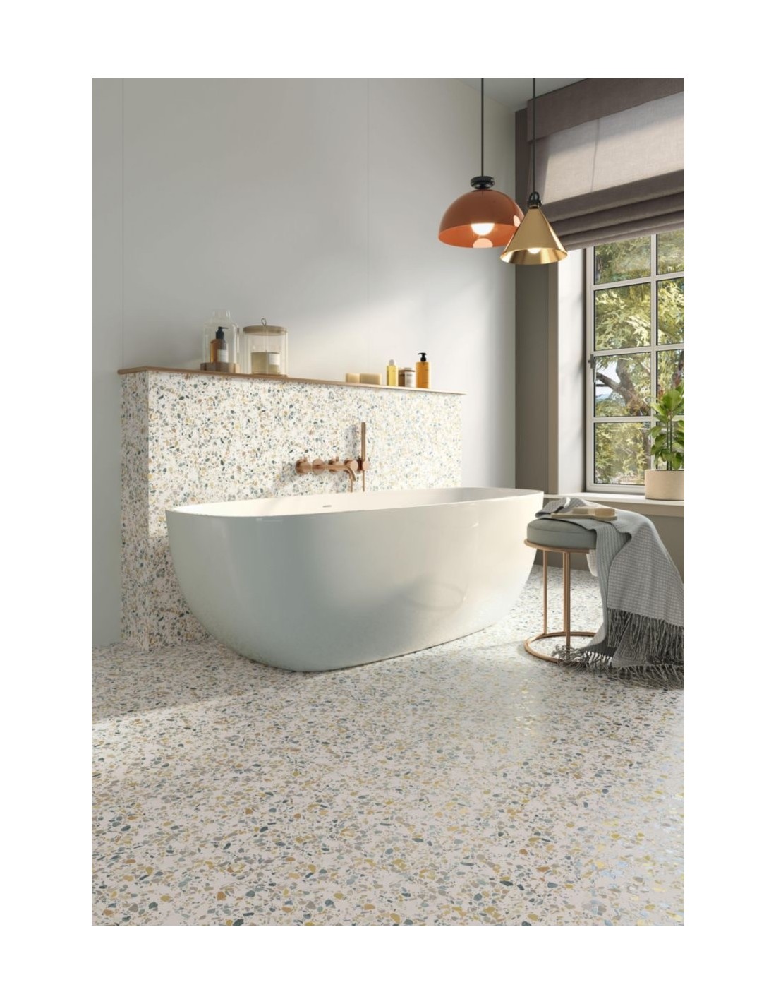 Sanitshop propose La collection Flakes , composée d'un type de revêtement exceptionnel :  petit format effet Terrazzo en finition mat . Ce type de céramique est idéal pour décorer et recouvrir les murs et sols  intérieurs, car il apporte une touche élégante et moderne à n'importe quelle pièce. Sa finition mat  reflète subtilement la lumière, créant une atmosphère lumineuse et sophistiquée.